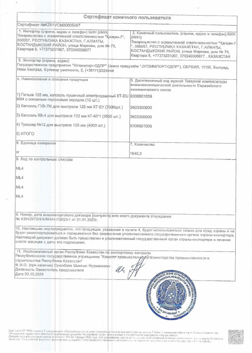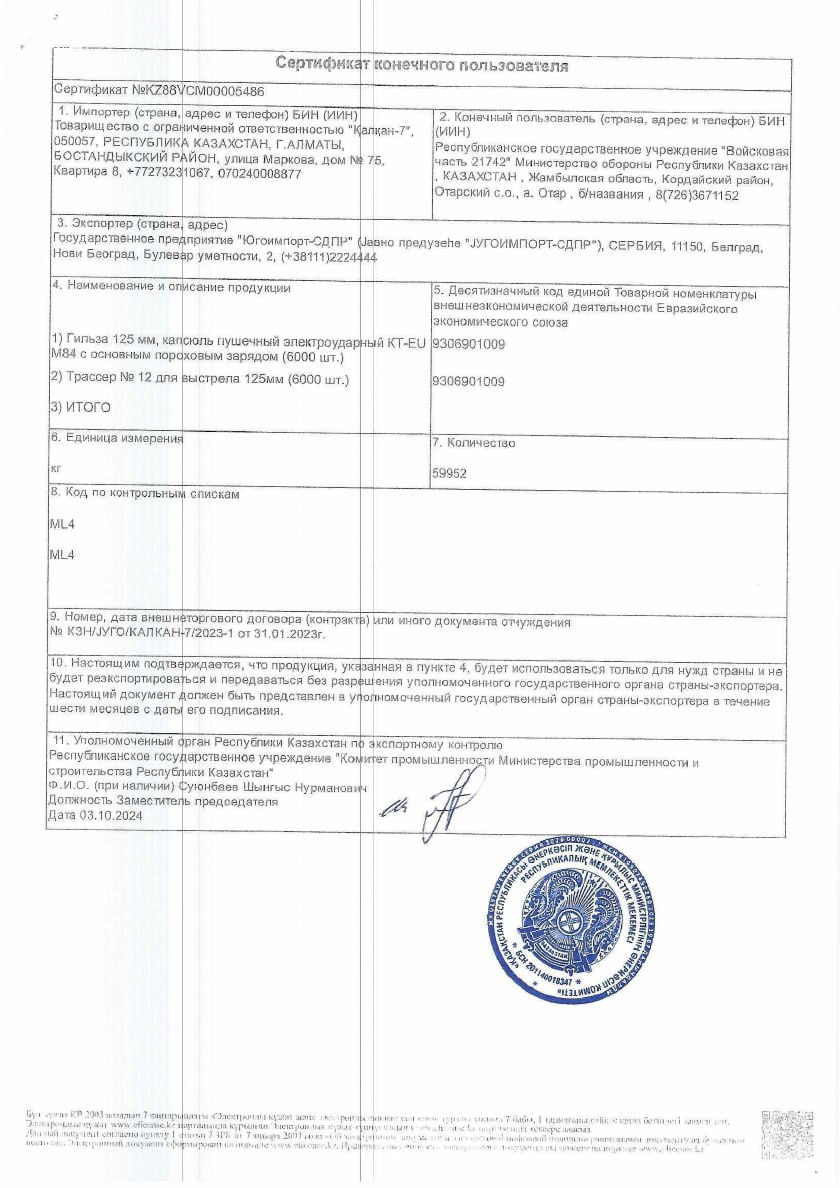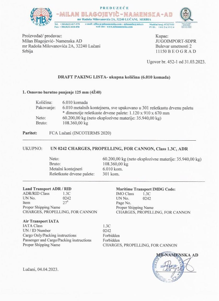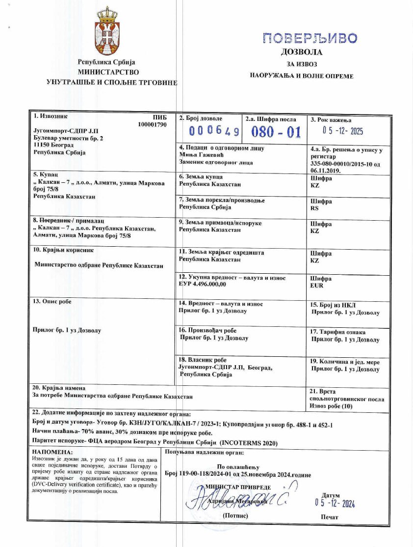Как стало известно, сербская компания «Югимпорт-СДПР» (г.Белград) поставляет оборудование казахстанским партнерам (ТОО «Калкан-7»; г. Алматы) для производства боеприпасов калибров от 122 мм до 155 мм. Примечательно, что снаряды данного типа использует украинская армия для обстрелов городов Донбасса.